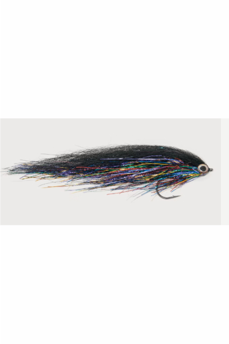 Black Predator er en 20cm lang gjedde flue med mye flash og syntetisk sort farget kropp. Denne gjør mye ut av seg i vannet og fungerer både i klart og grumsete vann. Bundet på black nickel krok i 4/0 størrelse av solid kvalitet.