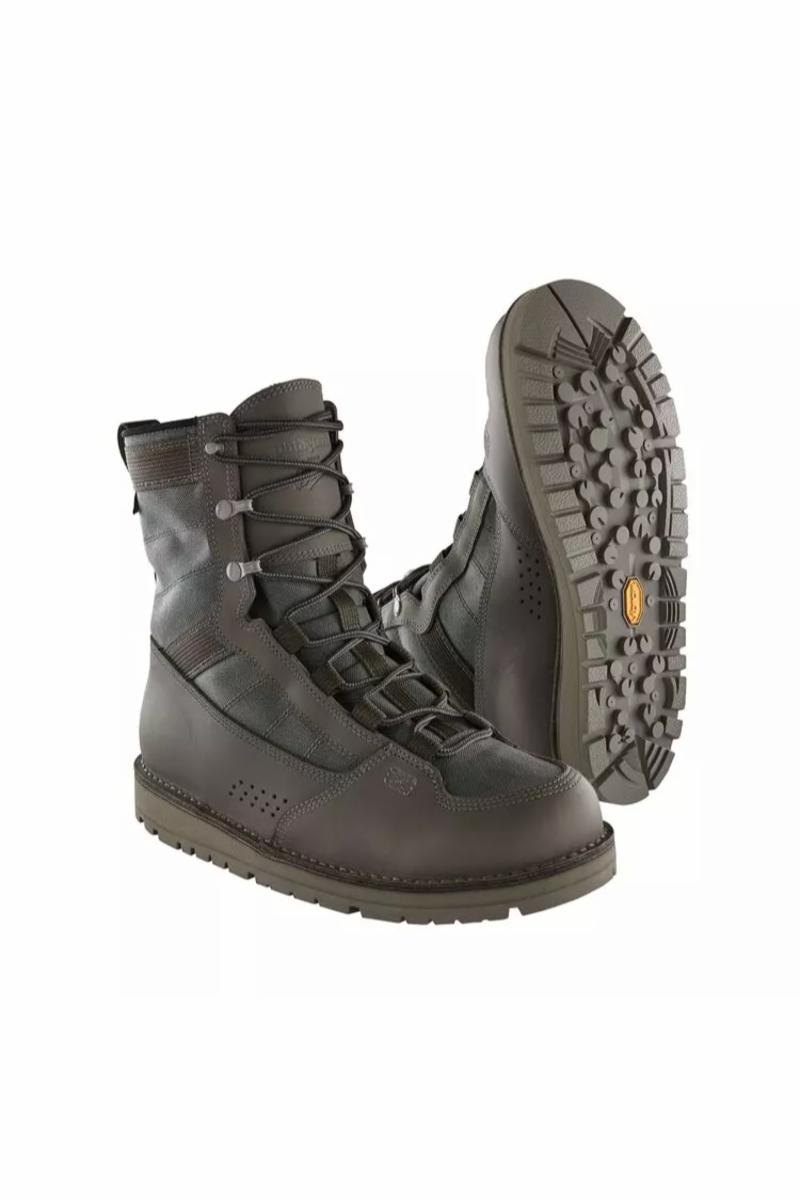 Patagonia River Salt vadesko hører innunder en serie vadesko laget på Danner fabrikken i USA, Portland Oregon. Det settes strenge krav til hva som kreves av en vadesko under saltvannsfiske, det slites enormt på sømmer og stoff når man vader blant rullesteiner og lignende. Dette er en håndlaget sko med de beste materialer, nettopp for å tåle tøff bruk over flere år. Fungerer utmerket til ferskvanns fiske også. Dette skal være den siste vadeskoen du kjøper. Skoen er bygd opp sånn at sålen skal kunne byttes når utslitt. Bedre å fikse enn å kaste, helt i tråd med Patagonias tankegang. Vi på Nordisk Fiskeutstyr har fått testet både River Salt og Foot Tractor alu over en lang periode nå og vi er særdeles fornøyd med kvalitet og komfort. River Salt skoen leveres med studs av stål, de opplevde vi under test til å ikke fungere så bra. Defor leverer vi med tungsten studs, så får du den beste gripeevne. Danner skoene har en del lær partier, som betyr at det er viktig å skylle de i ferskvann etter bruk i saltvann. Salt tørker ut læret, så de bør smøres av og til med silikonbasert impregnering. OBS. Hvis du for eksempel bruker størrelse 11 i dine gamle vadesko, så skal du ha River Salt i størrelse 12. Gjelder bare River Salt skoen. -Slitesterk, vanntett lær av beste kvalitet. -Kraftig, 1000-denier, 100% nylon skopanel gir solid holdbarhet mot slitasje. -Perforert drenerings hull på hver side av skoen. -Vibram megagrip såle for den beste gripe evnen på tørt og vått underlag. -Vibram såle kan erstattes når/hvis utslitt. -Oppbyggingen av skoen gir utrolig god støtte og komfort. -En sko i størrelse 12 veier 873 gram. -Feather Grey farge